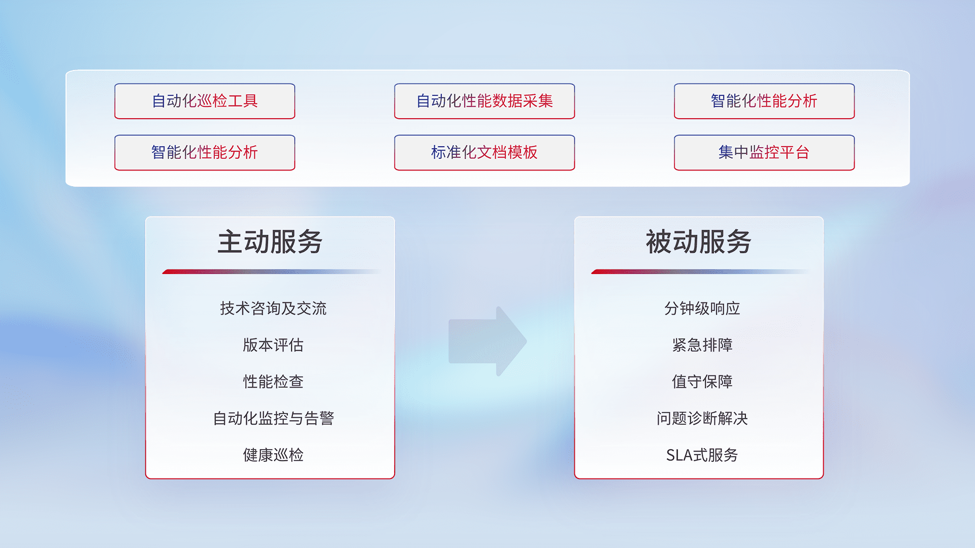 智能化工具和标准化文档,,,保障服务质量,,提供主动服务(包含技术咨询、、版本评估、、、、性能检查、、、、自动化监控与告警、、健康巡检)和被动服务包含(分钟级响应、、、、紧急排障、、、值守保障、、、问题诊断解决、、、、SLA服务)。。。。