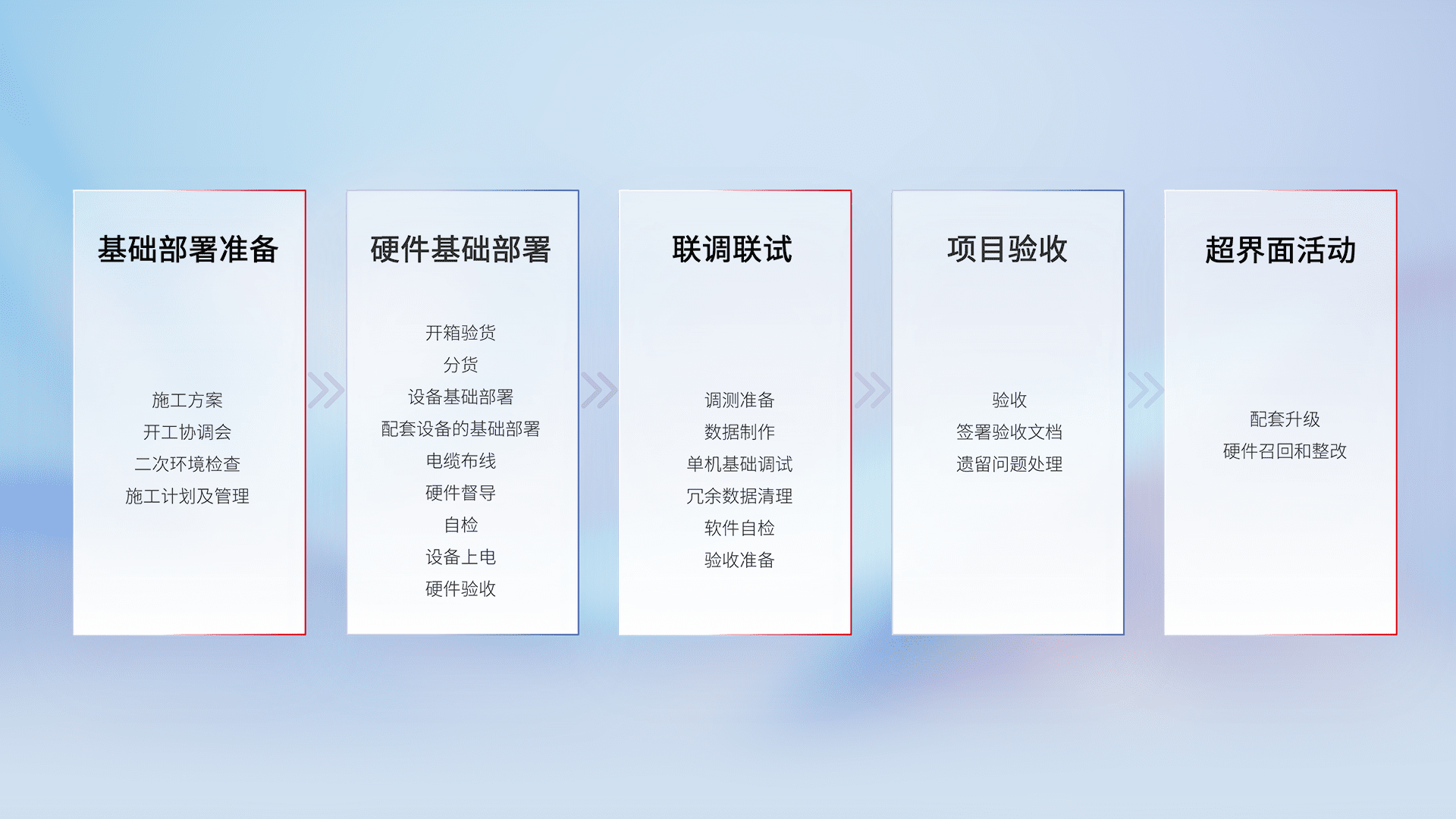 从基础部署准备、、、、硬件基础部署、、联调联试、、、、项目验收、、越界面活动的全过程可追溯,,,,保证施工质量和进度。。。。
